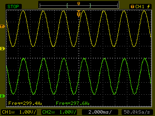 DAC0 (CH2) and the Function Generator (CH1) was captured on the oscilloscope in the image below.