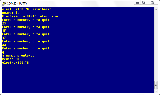 This is a port of Malcolm Mclean's MiniBasic interpreter. The interpreter can be extended with your own functions and could be the basis of a specialized interpreter for a vertical application. Simple LED and button functions are included as samples. The interpreter can also be executed via CGI from a web page, allowing programmable remote control of board functions.