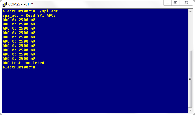 This example makes 10 readings of SPI ADC0 on header J7-1 and prints the results on standard output. Do not use voltages over 3.3V for this test.