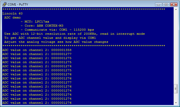 This example shows you how to read voltages from channel 2 of the ADC at a rate of 200 kHz in interrupt mode. The screen output is shown below. Note that the voltages are shown in integer format. The 12-bit value goes between 0 and 4095 (0x0FFF) for the range 0.00V to 3.30V resulting in an accuracy of +/- 402.8 µV. Note that voltages over 3.3V should not be applied to the ADC inputs as they could damage the microcontroller. Op-amps or other alternatives should be used to implement scaling and isolation. The first UART, which is connected to the COM1 on the Lincoln microcontroller board, is configured for 115,200 bits per second, and 8-n-1 mode. When the program is started a message will be printed to the terminal.