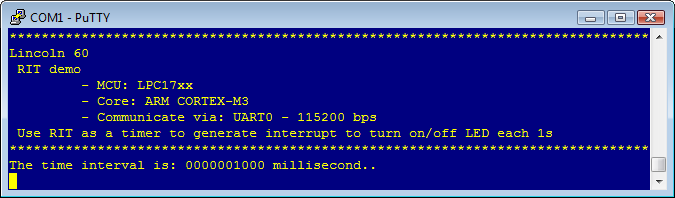 This example describes how to use RIT as a timer to generate an interrupt to blink User LED1 once a second.