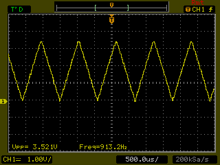 This example shows how to use the DAC to generate triangle and square waves. The signal output is shown below. In integer format the 12-bit outputs go between 0 and 4095 (0x0FFF) for the range 0.00V to 3.30V in steps of 806 µV. Op-amps or other alternatives should be used to implement scaling and isolation.