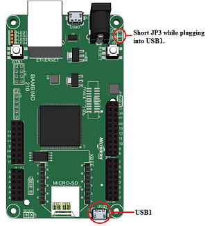 Setting JP1 to pins 2 and 3 will allow the board to be powered through the optional USB debug port (J15) or through the JTAG connector (J5). The maximum available current for the board will be limited to the USB host port that is supplying the power to the optional USB debug port. A maximum of 500mA total current draw is allowed when powering the board through the JTAG connector or is limited by the device supplying the power. The J-Link for example only allows 300mA of current.